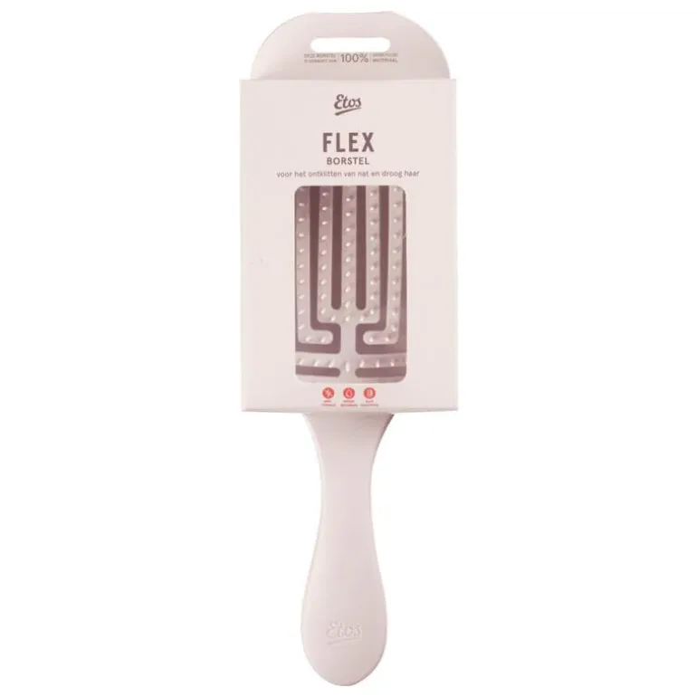 De Etos Flex Borstel is ontworpen om zich flexibel aan te passen aan de vorm van je hoofd, waardoor het borstelen van je haar comfortabeler wordt. Deze buigzame borstel is voorzien van flexibele, nylon pennen die zacht door je haar glijden zonder te trekken of te breken. Ideaal voor het ontklitten van zowel nat als droog haar, deze borstel is geschikt voor alle haartypes en zorgt voor een glad en klitvrij resultaat.
