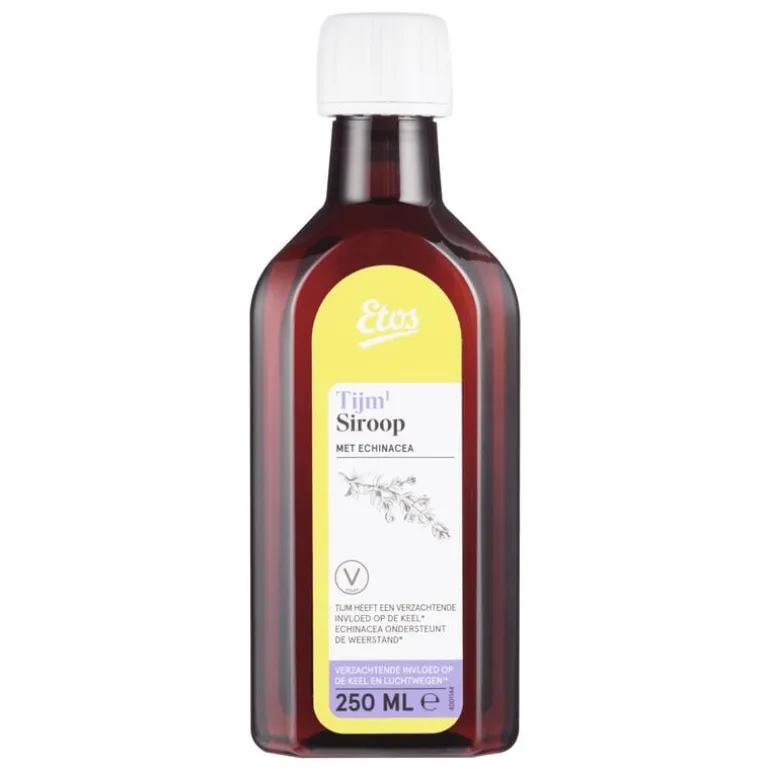 Etos siroop met tijm1- en echinacea-extract kan gebruikt worden wanneer je last van je keel hebt. De tijm heeft een verzachtende invloed op de keel* en de echinacea ondersteunt de weerstand*.
