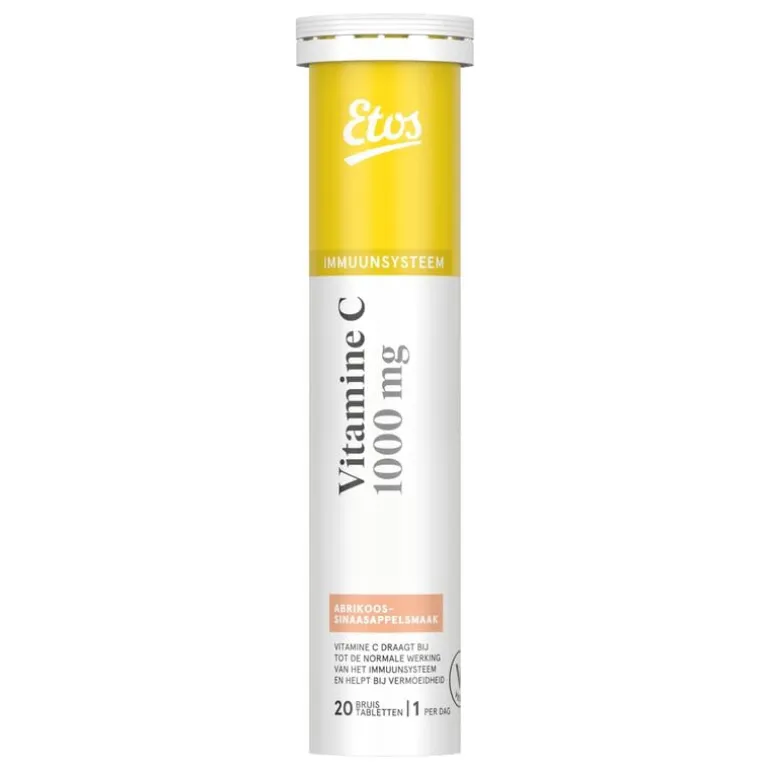 Ontdek de Etos Vitamine C bruistabletten met abrikoos en sinaasappel smaak. Deze bruisende vitamine C-tabletten dragen bij tot de normale werking van het immuunsysteem en helpt vermoeidheid te verminderen.Een voedingssupplement is geen vervanging van een gevarieerde voeding en een gezonde levensstijl.
