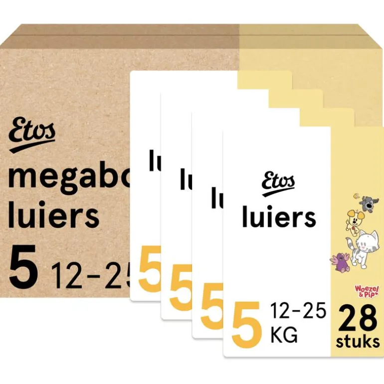 • Woezel & Pip design. Etos Woezel & Pip Luiers hebben een exclusief Woezel & Pip design. In de verpakking zitten 2 verschillende soorten designs.