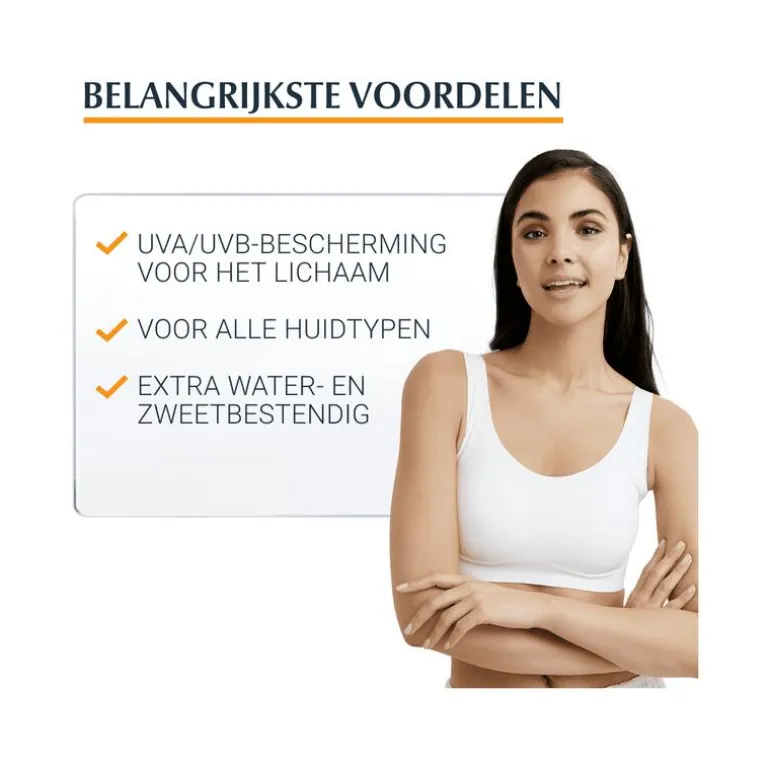 “Eucerin Sun Gel-Crème Dry Touch Sensitive Protect SPF 50+ is een ultra lichte, niet-vette zonnebescherming voor het lichaam. Het product trekt zeer snel in en laat geen restjes achter. Het is extra water- en zweetbestendig en ‘anti-zand’ (zand blijft niet aan de huid plakken).