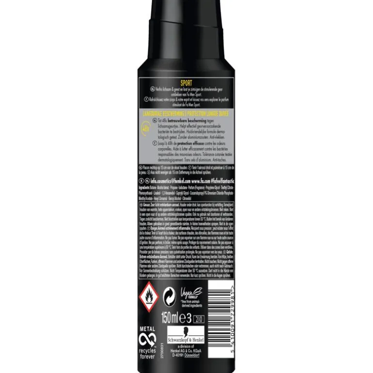 De Fa Men Sport deodorant & body spray heeft een anti-vlekken formule. De huidvriendelijkheid is dermatologisch getest.