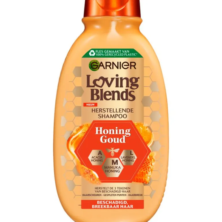 De Loving Blends Honing Goud Shampoo van Garnier is onze ultieme shampoo voor beschadigd haar. De wetenschap van de 3 herstellende honingen: acacia, manuka en lavendel, bekend om hun herstellende, versterkende & voedende eigenschappen. Samengebracht in onze herstellende shampoo om de 3 voornaamste tekenen van haarbeschadiging zo intens mogelijk te herstellen: – -53% haarscheuren* – 2x minder gespleten punten** – 10x minder haarbreuk** Garnier zet zich in voor green beauty. Formule zonder siliconen, voor een natuurlijk gevoel. 100% gerecyclede, recyclebare fles én navulbare fles***. Duurzaam geproduceerde acacia honing. Loving Blends is gecertificeerd door Cruelty Free International. Loving Blends steunt The Bee Conservancy. Ecologische impact Garnier zet zich voortdurend in om de ecologische en sociale impact van haar producten te verminderen tijdens hun gehele levenscyclus, dus inclusief gedurende de productie- en gebruiksfase. Daarnaast streven wij ernaar om jou op een transparante manier toegang te geven tot deze gegevens, zodat jij beter geïnformeerde beslissingen kunt maken over welke producten je aanschaft. Daarom lanceert Garnier het Product Impact Labelling Systeem. Om zo transparant mogelijk te zijn is deze methode ontwikkeld met de hulp van onafhankelijke wetenschappelijke experts en de gegevens zijn gecontroleerd door het onafhankelijke Bureau Veritas. Dit product krijgt een B. *Oppervlakteschade, Instrumentele test na het gebruik van shampoo + masker. **Instrumentele test na gebruik van shampoo en conditioner of na het masker alleen. ***100% gerecyclede plastic fles, met uitzondering van de kleurstoffen, additieven en de dop.