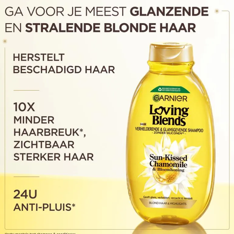 Garnier Loving Blends Sun-Kissed Chamomile & Bloemhoning shampoo reinigt mild, geeft glans, verheldert, verzacht & herstelt. Ontdek de verzachtende kracht van Kamille en de voedende werking van Bloemhoning. Samengevoegd in een verhelderende & glansgevende formule die de beschadigde haarvezels herstelt*, verzacht & een langdurige, verhelderende glans onthult. Voor gezond stralend blond haar met natuurlijke reflecties. De formule is geschikt voor alle verschillende types blond: natuurlijk, gehighlight & gevoelig. Garnier zet zich in voor Green Beauty. Ontdek voor nog meer verzorging de gehele routine. Garnier zet zich voortdurend in om de ecologische en sociale impact van haar producten te verminderen tijdens hun gehele levenscyclus, dus inclusief gedurende de productie- en gebruiksfase. Daarnaast streven wij ernaar om jou op een transparante manier toegang te geven tot deze gegevens, zodat jij beter geïnformeerde beslissingen kunt maken over welke producten je aanschaft. Daarom heeft Garnier het Product Impact Labelling Systeem geïntroduceerd. Om zo transparant mogelijk te zijn is deze methode ontwikkeld met de hulp van onafhankelijke wetenschappelijke experts en de gegevens zijn gecontroleerd door het onafhankelijke Bureau Veritas. *Instrumentele test na gebruik van shampoo + conditioner.