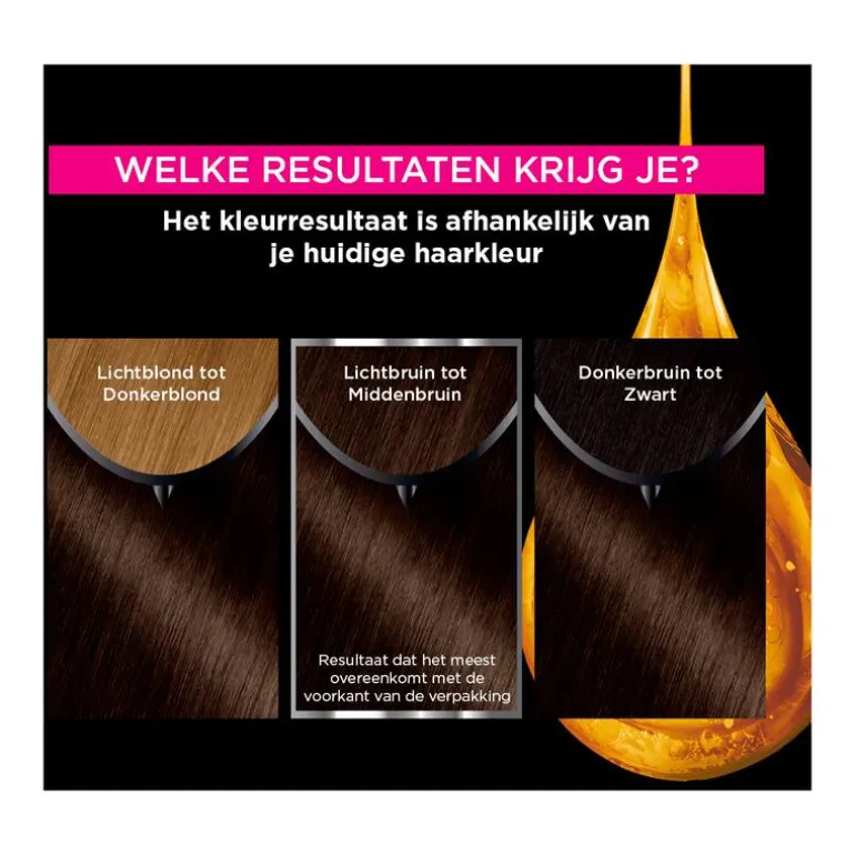 VOORZORGSMAATREGELEN HAARKLEURSTOFFEN KUNNEN ERNSTIGE ALLERGISCHE REACTIES VEROORZAKENLees en volg de instructies.Dit product is niet bestemd voor gebruik bij personen jonger dan 16 jaar.TIJDELIJKE TATOEAGES MET ZWARTE HENNA KUNNEN LEIDEN TOT EEN VERHOOGD RISICO OP EEN ALLERGISCHE REACTIE.Kleur uw haar niet als:• u last heeft van uitslag in het gezicht of van een gevoelige, geïrriteerde of beschadigde hoofdhuid• u eerder een reactie na een haarkleuring heeft gehad• u in het verleden een reactie heeft gehad na een tijdelijke tatoeage met zwarte hennaALLERGIE NEGEREN KAN LEVENSBEDREIGEND ZIJN Het is noodzakelijk een ALLERGIE WAARSCHUWINGSTEST 48 uur vóór iedere haarkleurbehandeling uit te voeren zelfs indien u al eerder een kleurproduct heeft gebruikt.Denk eraan het product 48 uur van te voren te kopen. (lees en volg de gebruiksaanwijzing). Bij een reactie of bij twijfel, raadpleeg een arts voordat u een kleurproduct gebruikt.”De ontwikkelvloeistof’’ bevat waterstofperoxide.“Het kleurproduct”a bevat: fenyleendiaminen, resorcinol, fenyleendiaminen (tolueendiaminen), ammoniak.• Bijgevoegde handschoenen dragen.• Contact van het product met de ogen vermijden. Niet gebruiken voor het kleuren van wimpers of wenkbrauwen. • Bij contact van het product met de ogen onmiddellijk met overvloedig water spoelen • Spoel het haar na de inwerktijd van het product goed uit.Wacht 2 weken na een permanent of een behandeling met een duurzaam gladmakend product.Niet gebruiken als uw haar gekleurd is met henna of een progressieve kleuring. Buiten bereik van kinderen houden.VOLG DE GEBRUIKSAANWIJZING Raadpleeg de ingrediëntenlijst onder dit kader.