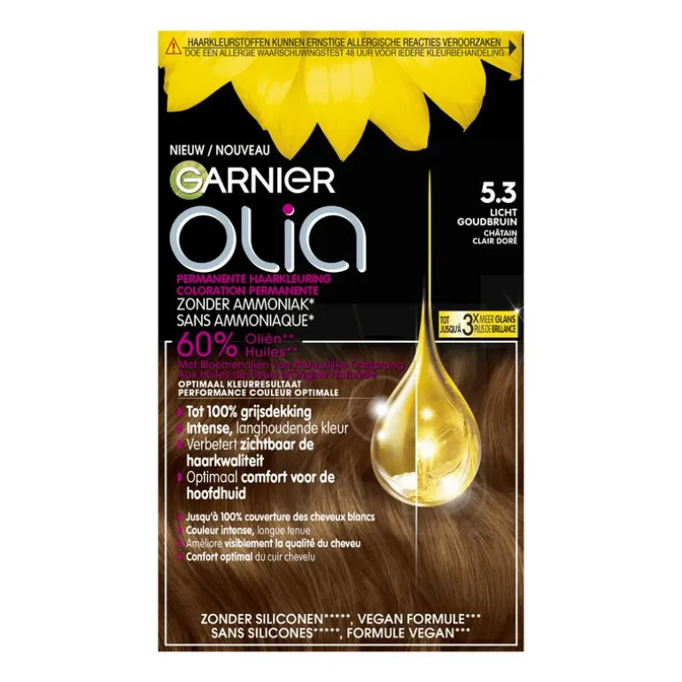 Garnier Olia is een permanente haarkleuring op basis van oliën, biedt tot 100% grijsdekking zonder ammoniak voor een aangename geur. Door de mix van oliën met natuurlijke bloemen die zijn toegevoegd aan de kleurcrème, dringen de kleurpigmenten tot dieper in je haar. Dit zorgt voor optimaal resultaat en zichtbare verbetering van haarkwaliteit. De verpakking bevat kleurcrème, ontwikkelcrème, nabehandeling, handschoenen en gebruiksaanwijzing. De fluweelzachte textuur maakt thuisapplicatie eenvoudig, terwijl de nabehandeling zonder siliconen het haar natuurlijk laat aanvoelen, met langdurige glans en verzorging.