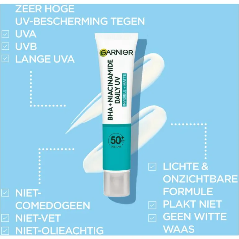 Ontdek de Garnier PureActive Daily UV Fluid met SPF 50+, een ultralicht en transparant verzorgingsproduct dat de huid beschermt tegen zonnestralen en zonneschade voorkomt, terwijl het tegelijkertijd onzuiverheden zoals puistjes, acnevlekken en vergrote poriën vermindert. De vegan formule, verrijkt met Niacinamide en BHA, reinigt diep en zorgt voor een stralende, egalere huid. Met een zonbeschermingsfactor SPF 50+ biedt deze UV Fluid dagelijkse bescherming tegen UVA-, UVB- en lange UVA-stralen, terwijl het intensieve hydratatie biedt.