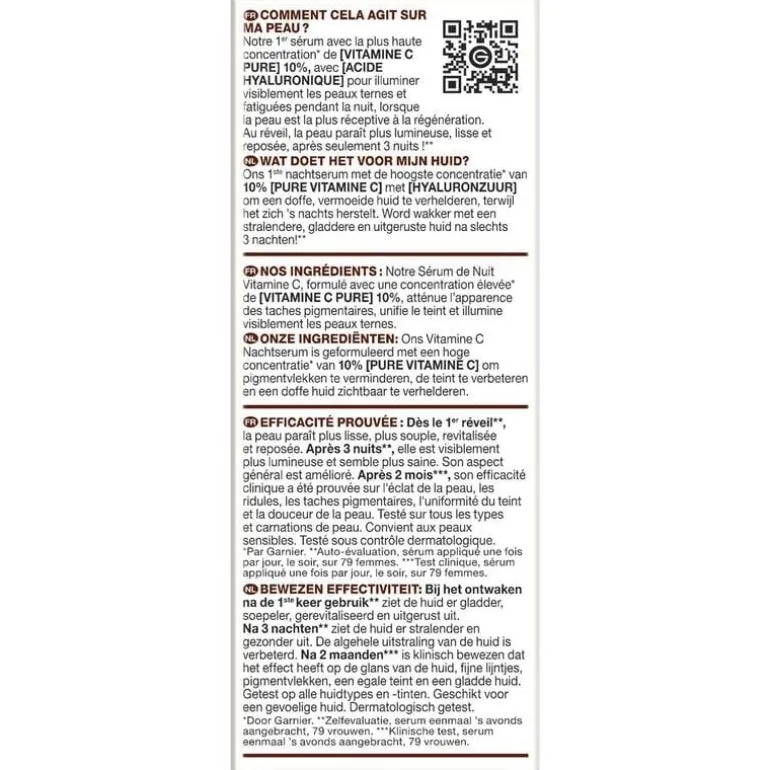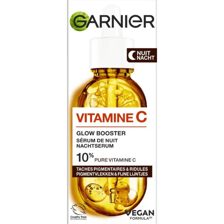 Resultaten: – Na het eerste gebruik:* De huid lijkt gladder, soepeler, gerevitaliseerd en uitgerust. – Na 3 nachten:* De huid ziet er stralender & gezonder uit. – Na 2 maanden:** Zichtbare vermindering van pigmentvlekken, de huid straal, fijne lijntjes zijn verminderd, de huid lijkt zichtbaar egaler en gladder. *zelf-evaluatie, serum één keer per nacht aangebracht door 79 vrouwen **klinische test, serum één keer per nacht aangebracht door 79 vrouwen. Gebruiksaanwijzing: Breng 3-4 druppels aan op een schoon gezicht en een schone hals. Vermijd de oogcontouren. Dit serum op waterbasis bevat een hoge concentratie puur vitamine c van natuurlijke oorsprong. Het is geformuleerd zonder siliconen waardoor de huid mogelijk de eerste seconden na aanbrengen ‘plakkerig’ aanvoelt. Gebruik een nachtcrème voor het optimale resultaat. Vermijd de oogcontouren. Bij contact met de ogen onmiddellijk overvloedig met water spoelen. Garnier SkinActive Vitamine C Routine: Stap 1: Gebruik de Garnier SkinActive Micellair Reinigingswater Vitamine C* om je gezicht te reinigen, make-up te verwijderen en je huid te verzachten. Stap 2: Breng overdag een 1 gevulde pipet van het Garnier SkinActive Vitamine C* Anti-Pigmentvlekken dagserum en ’s avonds 3-4 druppels van het Garnier Skinactive 10% Pure Vitamine C* Anti-Pigmentvlekken Nachtserum aan op het gezicht. Breng aan op een schoon gezicht en een schone hals. Vermijd hierbij de oogcontouren. Verminder zo pigmentvlekken en laat de huid stralen**. Stap 3: Breng de Garnier Bio Dagcrème met Vitamine C* of Garnier SkinActive – Serum Cream met Vitamine C* en SPF 25 aan om je huid te hydrateren en een natuurlijke glow boost te geven. Stap 4: Gebruik de Garnier SkinActive Glow Booster Oogcrème Met Vitamine C* om ook de oogcontouren een glow boost te geven en de effectieve tekenen van vermoeidheid te verminderen***. Gebruik daarnaast het Garnier SkinActive Tissue Masker met Vitamine C* drie keer per week: na 15 minuten is de huis intens gehydrateerd, ziet er stralend uit en voelt soepeler aan. Een vitamine C derivaat zoals vitamine Cg heeft de voordelen van vitamine C, maar dan in een gestabiliseerde formule. Vitamine C is van nature instabiel wanneer het wordt blootgesteld aan verschillende externe factoren, zoals zuurstof en zonlicht, waardoor het moeilijk is om het op betrouwbare wijze te formuleren in cosmetische producten. De houdbaarheid na openen van vitamine C formules met een derivaat is vaak langer dan die van puur vitamine C. *Vitamine Cg is een afgeleide van Vitamine C **zelf-evaluatie, serum één keer per nacht aangebracht door 79 vrouwen *** klinische score, 75 personen na 4 weken, gemiddeld resultaat, individuele resultaten kunnen verschill