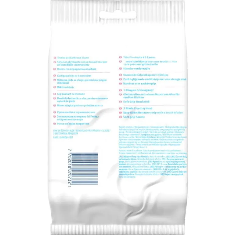 Het Gillette Simply Venus 3 wegwerpmesje voor vrouwen heeft 3 mesjes voor een gladdere scheerbeurt met minder wondjes en sneetjes (in vergelijking met de Simply Venus 2).