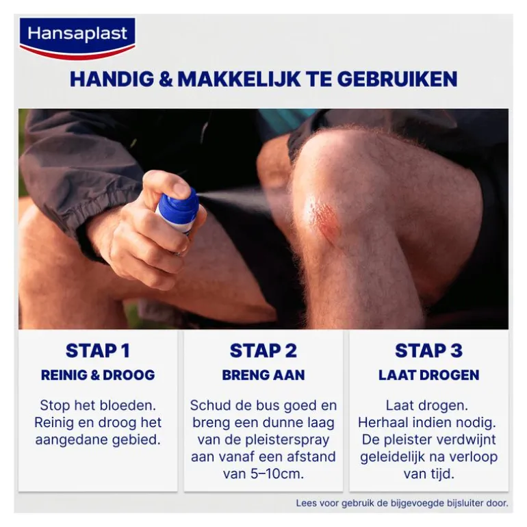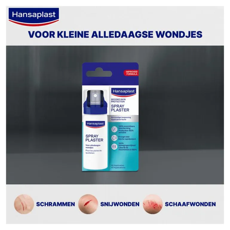 - DROOGT SNEL: De Hansaplast Plaster Spray droogt snel bij het aanbrengen en vormt een beschermende film. Het wondverzorging werkt voor kleine, oppervlakkige, alledaagse wonden zoals schrammen, snijwonden en schaafwonden.