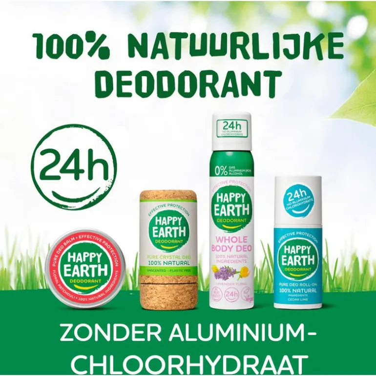 Happy Earth biedt vrolijkheid en optimisme met de beste producten voor jou én de aarde. Het ruime assortiment bestaat uit deodorant, douchegel, handzeep, babyverzorging, bars en lichaamsverzorging. Bij Happy Earth gebruiken ze alleen 100% natuurlijke ingrediënten. De producten zijn vegan, microplasticvrij en vrij van nare toevoegingen. Daar wordt je huid extra blij van! Daarnaast zijn de verpakkingen zo duurzaam mogelijk: volledig zero waste, plasticvrij, tubes van suikerriet of 100% gerecycled plastic. En niet te vergeten: ze produceren in Nederland met groene energie. Happy Earth, happy you!