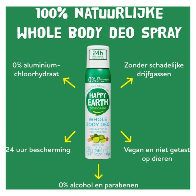 Happy Earth Whole Body Deo Spray Cedar Lime is een 100% natuurlijke vegan deo spray die gemaakt is van ingrediënten waar jouw huid én de aarde blij van worden. Deze deodorant is vrij van aluminium-chloorhydraat en bevat geen alcohol, parabenen of andere nare toevoegingen. Deze deodorant is speciaal ontwikkeld voor je hele lichaam, van oksels tot borst, dijen of waar je maar extra frisheid wilt.