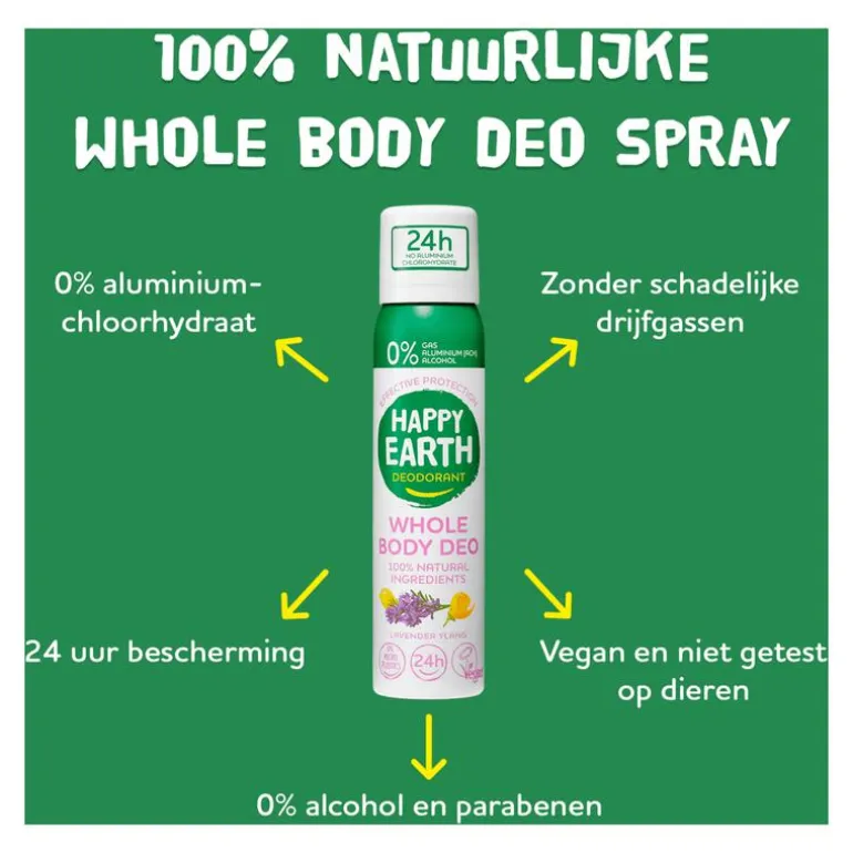 Happy Earth Whole Body Deo Spray Lavender Ylang is een 100% natuurlijke vegan deo spray die gemaakt is van ingrediënten waar jouw huid én de aarde blij van worden. Deze deodorant is vrij van aluminium-chloorhydraat en bevat geen alcohol, parabenen of andere nare toevoegingen. Deze deodorant is speciaal ontwikkeld voor je hele lichaam, van oksels tot borst, dijen of waar je maar extra frisheid wilt.
