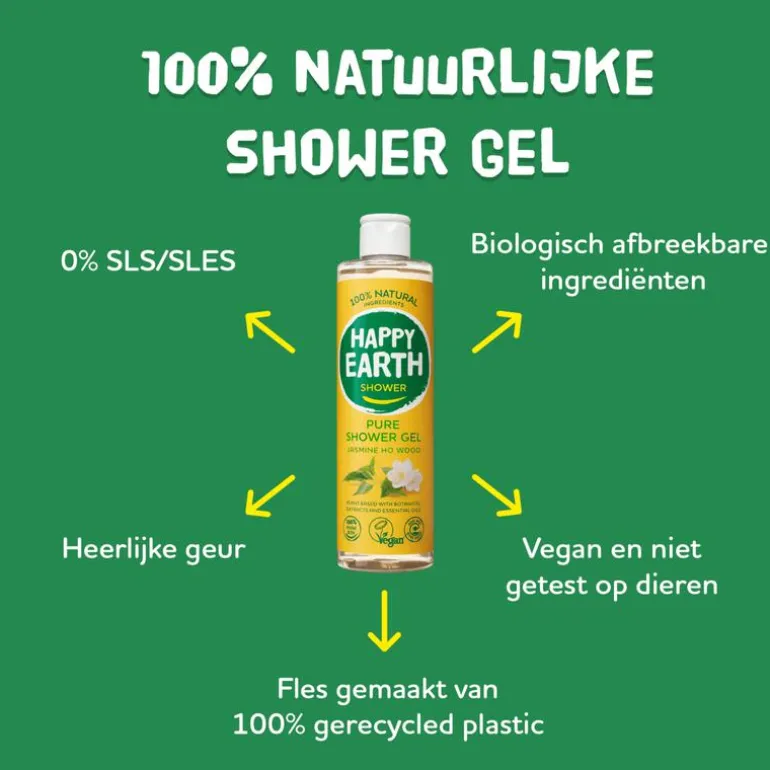 HAPPY EARTH Pure Shower Gel Jasmine Ho Wood is een 100% natuurlijke douchegel die gemaakt is van ingrediënten waar jouw huid én de aarde blij van worden. Als je iets op je huid aanbrengt en door het doucheputje spoelt, is het fijn om te weten dat er geen vervuilende en vervelende ingrediënten in zitten zoals SLS/SLES, parabenen, kleurstoffen of andere nare toevoegingen. En onze shower gel-flessen zijn gemaakt van 100% gerecycled plastic. Met trots dragen wij dan ook de keurmerken van NATRUE en Vegan Society. Happy Earth is gegarandeerd vrij van microplastics door het Zero Plastic Inside keurmerk van de Plastic Soup Foundation. Met deze shower gel zorg je goed voor jezelf en voor onze aarde!