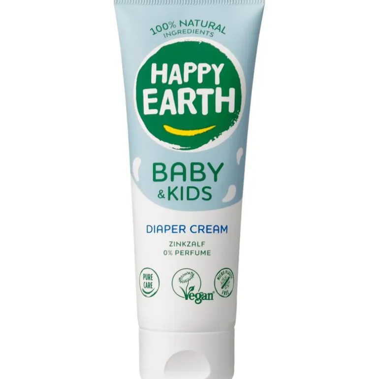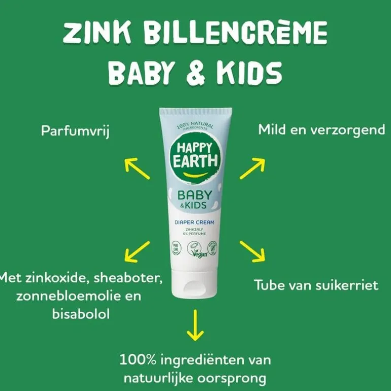 Happy Earth Zink Billencrème zonder parfum bestaat alleen uit 100% natuurlijke ingrediënten die zijn gecertificeerd door Natrue. De billencrème bevat geen parfum of chemicaliën, zodat je zeker weet dat je geen schadelijke producten aanbrengt op de huid van jouw baby en daardoor is deze crème ook te gebruiken bij geïrriteerde billen.