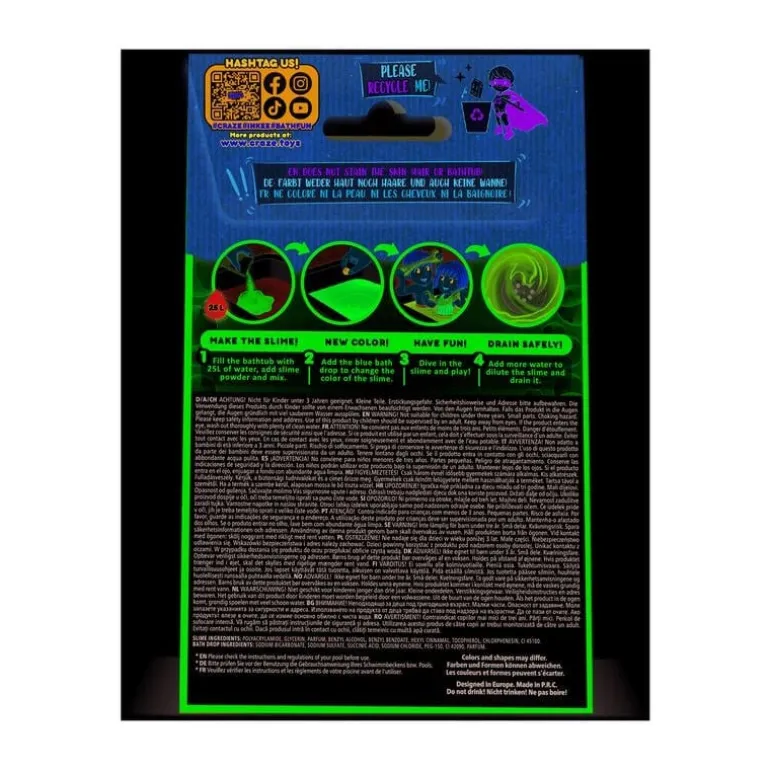 Strooi de inhoud in warm badwater en laat even staan. Na het spelen gewoon extra water toevoegen om het slijm op te lossen en af te spoelen.