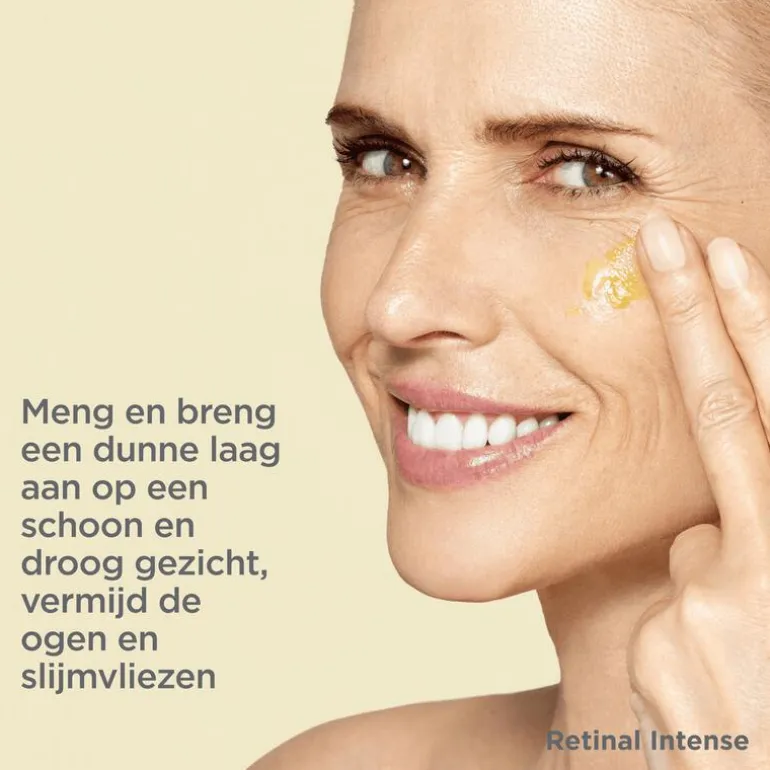 Gebruik Retinal Intense in uw nachtroutine. Doseer twee pompjes product en meng beide fasen tot een homogene kleur ontstaat. Breng een dunne laag aan op een schoon, droog gezicht, waarbij u de ogen en de slijmvliezen vermijdt.