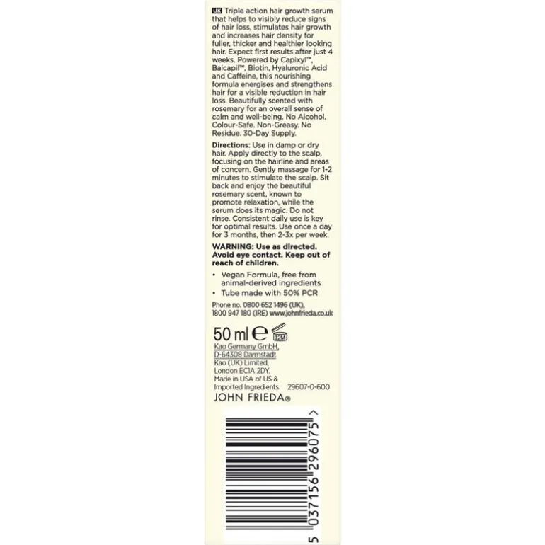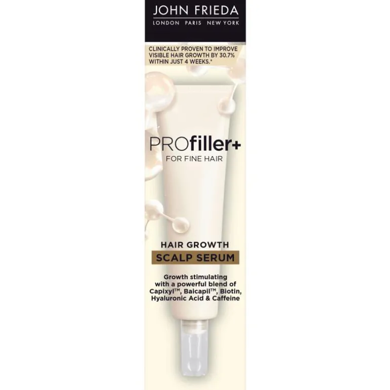 De John Frieda PROfiller+ Hair Growth Scalp Treatment met drievoudige werking stimuleert de haargroei met 30,7% binnen slechts 4 weken. Deze voedende formule, verrijkt met capixylTM, baicapilTM, biotine, hyaluronzuur en cafeïne, geeft je haar een boost en maakt het haar sterker, voor zichtbare vermindering van haaruitval.