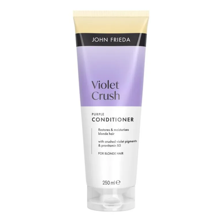 De John Frieda Violet Crush Daily Purple Shampoo is speciaal ontwikkeld om ongewenste gele ondertonen in blond haar te verminderen. Dankzij de gemalen Violet pigmenten en Provitamine B5 neutraliseert deze shampoo koperachtige tinten en geeft het je blonde haar een heldere, frisse uitstraling. De hydraterende formule reinigt zonder uit te drogen en is geschikt voor dagelijks gebruik.