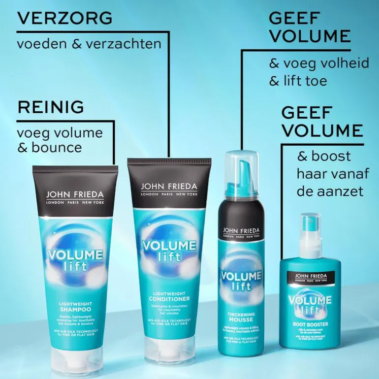 - Geef je haar volume en een ultralichte versteviging met de John Frieda Volume Lift Kickstarter Thickening Mousse. Onze lichtgewicht formule verrijkt met peptiden geeft een lichte, luchtige mousse met precieze dosering en maakt het haar voller voor een volumineuze look die zacht aanvoelt. Bied hittebescherming tot 230°.