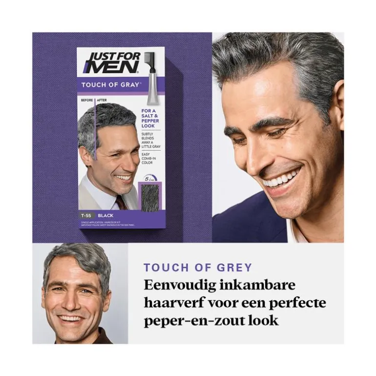 Just For Men Touch of Grey is de perfecte keuze voor mannen die er op hun best uit willen zien zonder hun karakteristieke grijze lokken helemaal te verliezen. Een vleugje grijs straalt volwassenheid en levenservaring uit—het geeft je uitstraling een uniek karakter. Touch of Grey is er voor jou: een eenvoudige, moeiteloze haarkleuring die je look naar een hoger niveau tilt zonder gedoe. Het is zo makkelijk als je haar kammen en klaar in slechts vijf minuten.