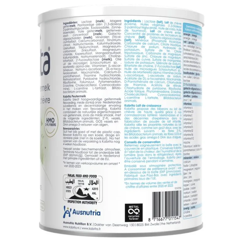 Kabrita combineert de natuurlijke eigenschappen van geitenmelk, zoals de milde smaak, met de beste ingrediënten zoals melkvet, verrijkende HMO 2’-FL, BB-12 probiotica, GOS:FOS vezels en DHA omega-3-vetzuren van algen.