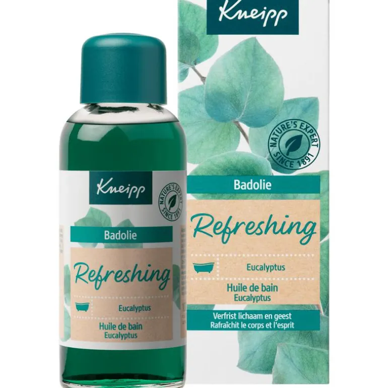 De weldadige Kneipp badolie Refreshing – Eucalyptus bevat een bijzonder hoog percentage etherische eucalyptusolie en zorgt voor een heerlijke badervaring. Het lichaam wordt tijdens het baden aangenaam verwarmd en door de verkwikkende geur van eucalyptus verbetert je welzijn.. De natuurlijke geurwerking van de etherische oliën ontwikkelt zich in combinatie met de weldadige werking van het warme water.