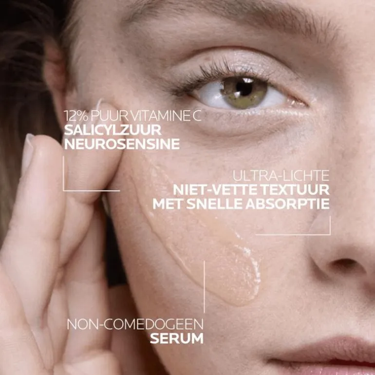 La Roche-Posay Pure Vitamin C12 Serum is een anti-aging gezichtsserum dat de natuurlijke huidvernieuwing ondersteunt verrijkt met 12% geconcentreerde vitamine C, salicylzuur en neurosensine. Deze gezichts- en halsverzorging kalmeert en verbetert de huid door rimpels, een doffe teint en een onregelmatige huidtextuur aan te pakken. De huid voelt onmiddellijk zachter en gehydrateerd aan. Het serum is geschikt voor alle huidtypes, in het bijzonder een gevoelige huid om deze opnieuw te laten stralen. De vederlichte, rijke textuur dringt snel in de huid en zorgt voor een niet-plakkerige, niet-vette finish. Het product is ook ideaal als make-up basis.