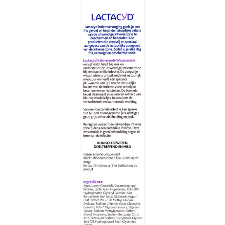Lactacyd Kalmerende Wasemulsie verzacht en ondersteunt de uitwendige intieme zone en helpt bij uitwendige intieme zonele ongemakken zoals irritatie, jeuk en roodheid. De zeepvrije gel bevat natuurlijk melkzuur en heeft een speciale pH-waarde om natuurlijke bescherming te bieden bij ongewenste uitwendige intieme zonele ongemakken.