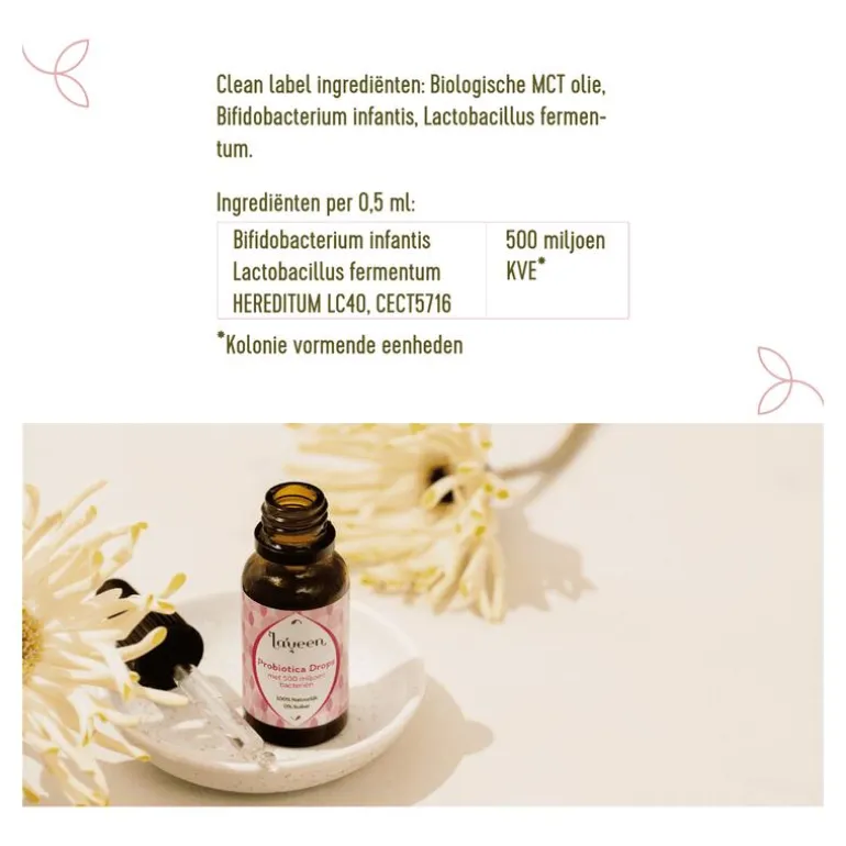 Bio-culturen drops is speciaal ontwikkeld voor baby’s vanaf de geboorte en jonge kinderen tot 4 jaar. Dit product is op basis van biologische MCT olie verkregen van kokosolie en is daardoor heel neutral van smaak. Ideaal om op de tepel te smeren tijdens borstvoeding, om toe te voegen aan de flesvoeding of gewoon op een lepeltje te geven. Bevat 500 miljoen cfu (colony forming units, oftewel: het aantal levensvatbare bacteriën dat in staat is zich te vermenigvuldigen en een kolonie te vormen) van 2 verschillende bacteriestammen Bifidobacterium infantis en Lactobacillus fermentum.