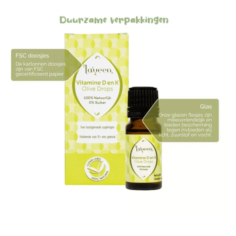 Laveen™ Olive Drops Vitamine D en K baby druppels zijn vitaminedruppels, gemaakt op basis van biologische olijfolie. Baby’s hebben behoefte aan vitamine D, maar in de eerste drie maanden na de geboorte zeker ook aan vitamine K. In onze Vitamine D en K baby druppels zitten voldoende vitamines om het advies van de Gezondheidsraad met betrekking tot de ADH oftewel de ‘Aanbevolen Dagelijkse Hoeveelheid’ aan vitamines D en K op te volgen. *