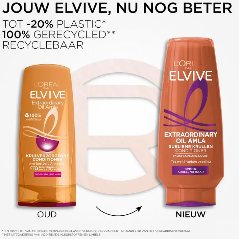 L’Oréal Paris Elvive Extraordinary Oil Amla Sublieme Krullen Conditioner is een conditioner voor droog, krullend haar. De formule verrijkt met amla olie* heeft een rijke textuur die de krullen intens voedt** voor een zichtbare transformatie, van wortels tot punten. Geef je haar tot wel 8 weken voeding***. De kracht van onze formule met kostbare amla* zorgt voor absolute zachtheid en creëert perfect gedefinieerde en veerkrachtige krullen. Jouw Elvive, nu nog beter! Onze vernieuwde fles is gemaakt met tot -20% minder plastic**** en is gemaakt van 100% gerecycled plastic*****. Daarnaast is de fles ook recyclebaar. *Extract. **Instrumentele test shampoo + conditioner. *** Eén fles = tot 8 weken gebruik, kan variëren afhankelijk van het gebruik en de lengte van het haar. ****Ten opzichte van de vorige verpakking. Plastic vermindering varieert afhankelijk van het verpakkingsformaat. *****Met uitzondering van de additieven, kleurstoffen en labels.