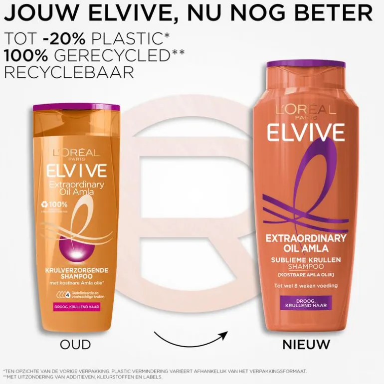 L’Oréal Paris Elvive Extraordinary Oil Amla Sublieme Krullen Conditioner is een conditioner voor droog, krullend haar. De formule verrijkt met amla olie* heeft een rijke textuur die de krullen intens voedt** voor een zichtbare transformatie, van wortels tot punten. Geef je haar tot wel 8 weken voeding***. De kracht van onze formule met kostbare amla* zorgt voor absolute zachtheid en creëert perfect gedefinieerde en veerkrachtige krullen. Jouw Elvive, nu nog beter! Onze vernieuwde fles is gemaakt met tot -20% minder plastic**** en is gemaakt van 100% gerecycled plastic*****. Daarnaast is de fles ook recyclebaar. *Extract. **Instrumentele test shampoo + conditioner. *** Eén fles = tot 8 weken gebruik, kan variëren afhankelijk van het gebruik en de lengte van het haar. ****Ten opzichte van de vorige verpakking. Plastic vermindering varieert afhankelijk van het verpakkingsformaat. *****Met uitzondering van de additieven, kleurstoffen en labels.