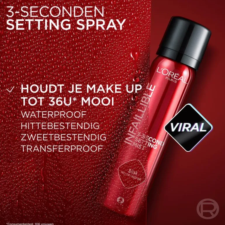 Ontdek de L’Oréal Paris Infaillible 3-Second Setting Mist Make-up Fixeer Spray, jouw onmisbare bondgenoot voor make-up die lang blijft zitten! Deze revolutionaire mist fixeert je make-up in slechts 3 seconden en garandeert een onberispelijke en transferbestendige fixatie die 36 uur aanhoudt. Deze lichte mist is ontworpen om de hele dag door een perfecte look te garanderen, en vergrendelt je make-up, waardoor deze niet kan afgeven en zijn frisheid behoudt. De innovatieve formule maakt gebruik van een microfijne nevel die snel droogt, zonder plakkerig residu of vlekken achter te laten. Bereid je voor op een “life-proof” make-up ervaring met Infaillible! Na het aanbrengen van de 3-Second Setting Mist blijft je make-up levendig, fris en perfect op zijn plaats, zonder transfer, voor een duur van maximaal 36 uur. Dit is een ware revolutie voor langdurige fixatie! De Infaillible 3-Second Setting Mist fixeer nevel is verkrijgbaar in een normale maat van 75 ML en een JUMBO formaat van 150 ML, zodat je nooit zonder jouw schoonheidsgeheim komt te zitten. (*Consumententest, 106 vrouwen)