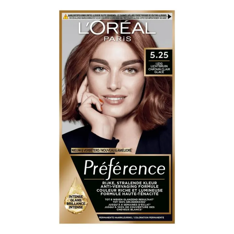 L’Oréal Paris Préférence is een permanente haarkleuring met tot 100% grijsdekking. De kleuring resulteert in een natuurlijke, stralende kleur met reflecties en langdurige glans. De verpakking bevat 5 componenten: kleurgel, ontwikkelcrème, glansbeschermende conditioner, handschoenen en gebruiksaanwijzing. De formule van Préférence bevat een UV-filter voor bescherming tegen zoninvloeden en Vitamine E ter ondersteuning van de haarkwaliteit. De glansbeschermende conditioner kan wekelijks worden gebruikt om de glans in het haar langer te behouden.