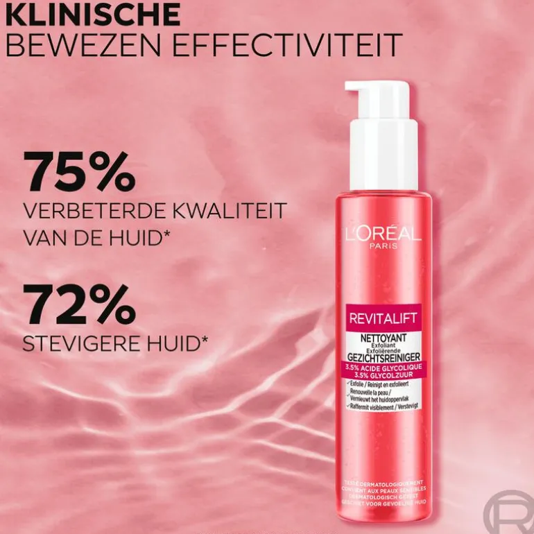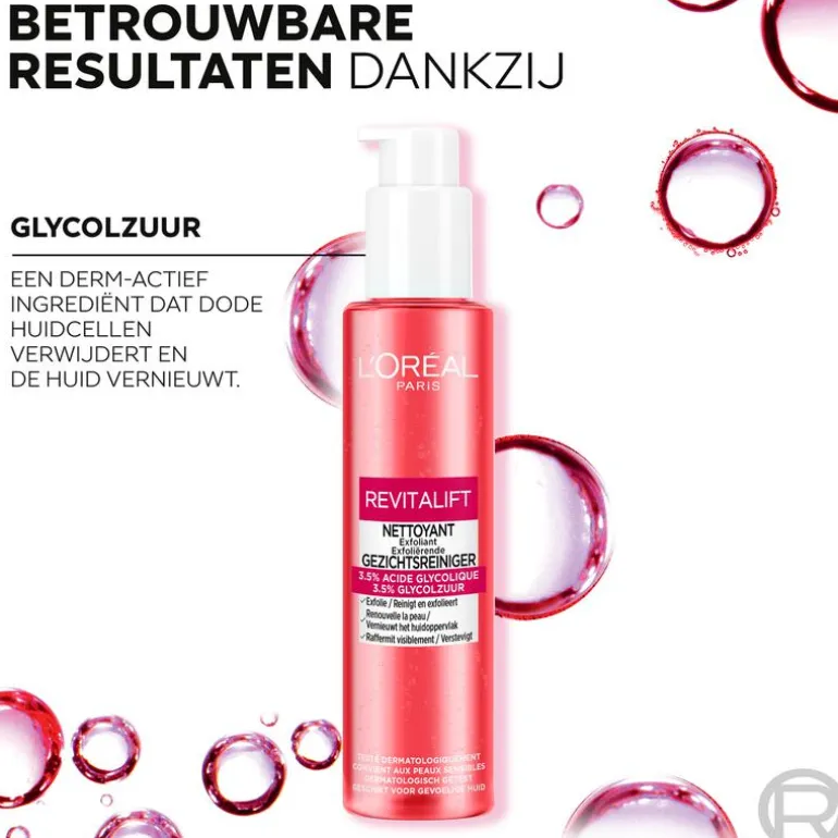 Ontdek de L’Oréal Paris Revitalift Gelreiniger met Glycolzuur, verrijkt met actieve serum ingrediënten: de perfecte combinatie van dermatologisch bewezen componenten voor een zuivere en stralende huid. Formule verrijkt met Glycolzuur, een krachtig AHA (alfahydroxyzuren), exfolieert de huid mild maar effectief. Het verwijdert dode huidcellen, verheldert de teint en vermindert zichtbaar pigmentvlekken en andere oneffenheden. Daarnaast stimuleert Glycolzuur de celvernieuwing, voor een gladdere, egalere en jeugdigere uitstraling.