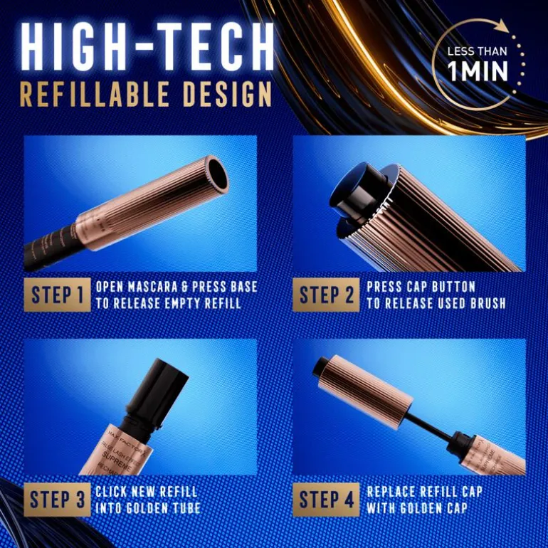 Maak kennis met Max Factor False Lash Effect Supreme Recharge, onze eerste hervulbaremascara. Geeft je wimpers direct tot 7x meer volume* en gezonder uitziende wimpers vanaf 4 weken**.
