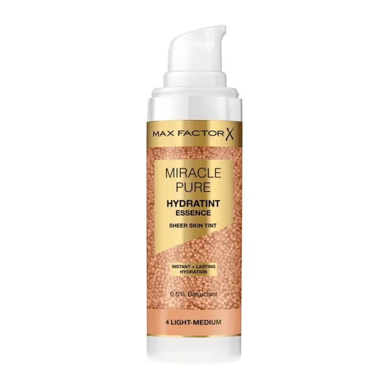 Max Factor Miracle Pure Hydratint Essence, de miraclemaker in huidverzorging voor make-upartiesten. Dit product geeft de huid een sterke hydratatieboost, waarna ze heerlijk fris aanvoelt en tot wel 24 uur lang optimaal gehydrateerd blijft. De vegan formule bestaat voor 71% uit water en is voor 0,5% verrijkt met bakuchiol en in microbolletjes ingekapselde kleurpigmenten. De formule is makkelijk te blenden en zorgt voor een stralend en toch heel natuurlijk dekkend kleurresultaat. Deze helder stralende getinte huidverzorging verbetert de veerkracht van de huid; een klinisch bewezen effect na 14 dagen gebruik!