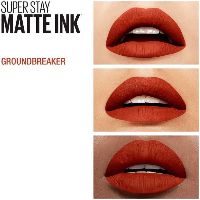 Maybelline New York introduceert de matte ink lipsticks met intense kleurimpact: SuperStay Matte Ink. SuperStay Matte Ink 117 Ground-Breaker is een liquid lipstick met een rode kleur.