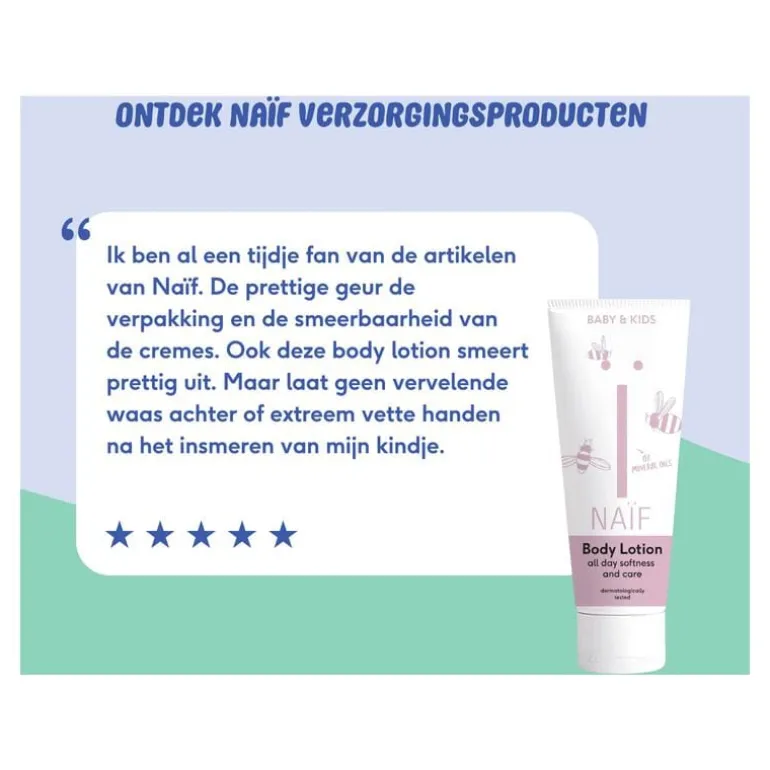 Ontwikkeld en geproduceerd in Nederland. Om de babyhuid zacht te houden, kan ‘ie best wat extra verzorging gebruiken. De Naïf Body Lotion voedt de huid en zit vol verzorgende en verzachtende oliën. Denk aan katoenzaad-, avocado-, zoete amandel- en macademia olie. Daarmee is de bodylotion zeer geschikt voor de gevoelige babyhuid. Alle producten van Naïf zijn gemaakt met ingrediënten van natuurlijke oorsprong, vegan en dermatologisch getest. Ook bevatten ze geen microplastics. Doe wat bodylotion op je handpalm en smeer in met ronddraaiende bewegingen. Je kunt onze bodylotion iedere dag gebruiken.