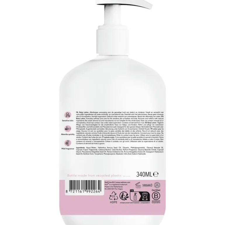 Hydrateert en voedt de huid met natuurlijke oliën als zoete amandel- en macadamia olie. Voor dagelijks gebruik & geschikt voor de gevoelige babyhuid.