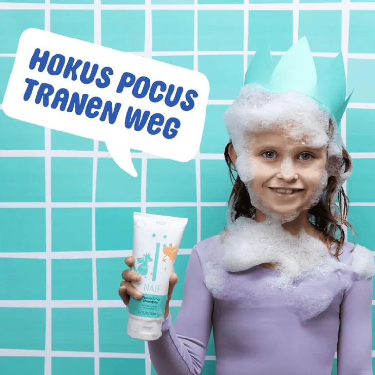 Maak haar en de hoofdhuid nat, neem een kleine hoeveelheid Naïf kindershampoo en masseer ’t zachtjes in. Goed inzepen en afspoelen. Et voilà: een zacht kinderkoppie. Deze shampoo prikt niet in de ogen. Maar, oogcontact vermijden is sowieso het beste.