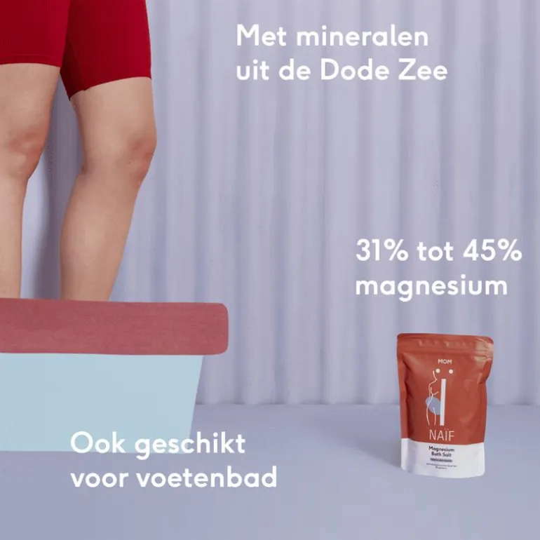 Extra tip: Naïf Magnesium Badzout ontspant je spieren en verlicht pijn en kramp dankzij de kalmerende werking van magnesium. Tijdens je zwangerschap wordt aangeraden om maximaal 15 minuten te badderen. Sta daarna rustig op uit het bad en spoel jezelf af.