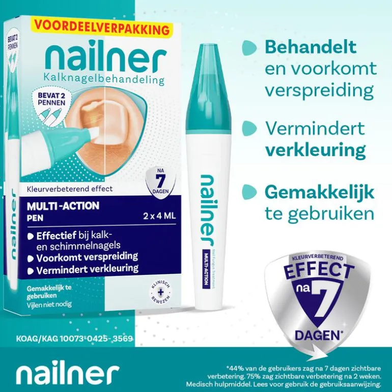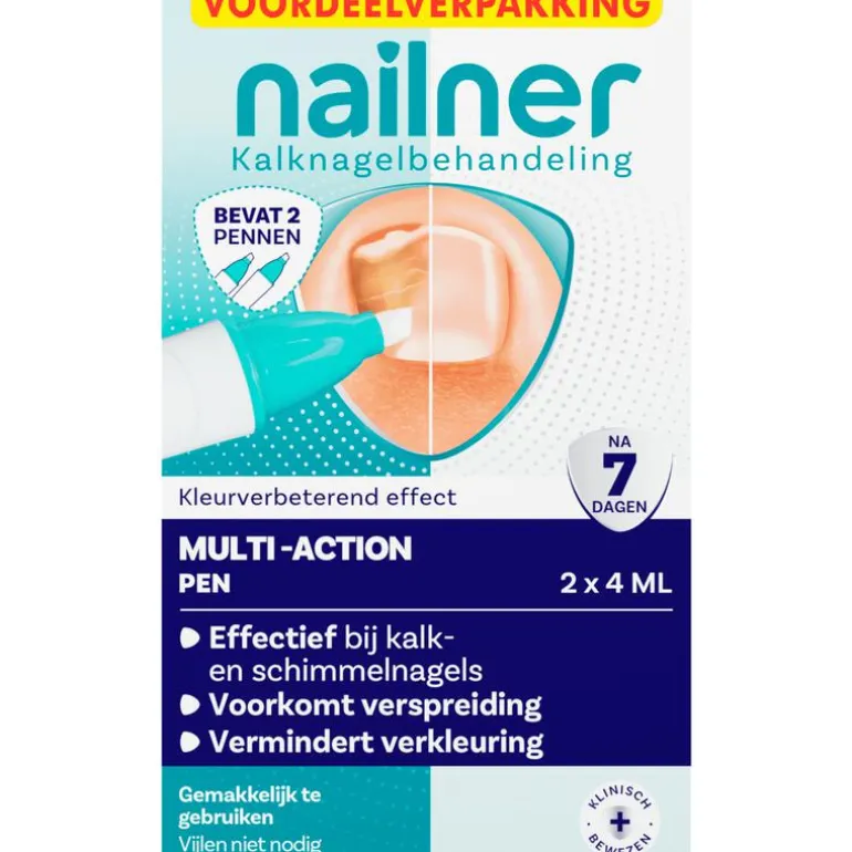 Nailner Multi-Action Kalknagelpen is een een effectieve en gemakkelijke manier om kalknagels te behandelen en voorkomen. Daarnaast zorgt het gebruik van Nailner ervoor dat de nagel er gezonder uitziet. Nailner Kalknagelpen heeft een uniek en gepatenteerd transportsysteem. Hierdoor kunnen de ingrediënten diep in de kalknagel doordringen. De pen bestrijdt de schimmel aan de basis en beschermt de nieuwe nagelgroei tegen infectie. Zichtbaar restulaat na 1 week! De handige pen zorgt ervoor tevens voor dat Nailner eenvoudig aan te brengen is op de nagel.
