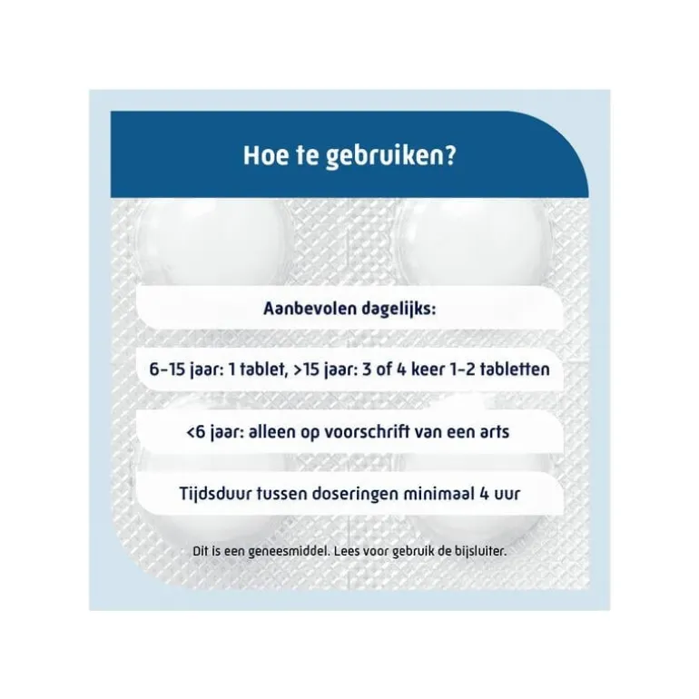De omhulde tabletten in hun geheel doorslikken, desnoods met wat water. Niet stukbijten, omdat dan de bittere smaak van het geneesmiddel vrijkomt. Dosering: – Kinderen jonger dan 6 jaar: alleen op voorschrift van de arts – Kinderen en adolescenten van 6 – 15 jaar: 3 tot 4 keer per dag 1 tablet– Adolescenten vanaf 15 jaar en volwassenen: 3 tot 4 keer per dag 1 of 2 tablet(ten). De tijdsduur tussen eventuele meerdere doseringen dient minimaal 4 uur te bedragen.Belangrijk: Verschijnselen van overdosering zijn o.a. opwinding, angst, huiduitslag, misselijkheid, braken, duizeligheid, slaperigheid, ademhalingsproblemen, versnelde hartslag, stuipen en coma. Wanneer u te veel van dit geneesmiddel heeft ingenomen, neem dan onmiddellijk contact op met arts of apotheker. Dosis gemist? Neem dan zo snel mogelijk deze dosis alsnog in. Als het echter bijna tijd is voor de volgende dosis, sla dan de gemiste dosis over en ga verder met het normale doseringsschema. Neem geen dubbele dosis om een vergeten dosis in te halen.