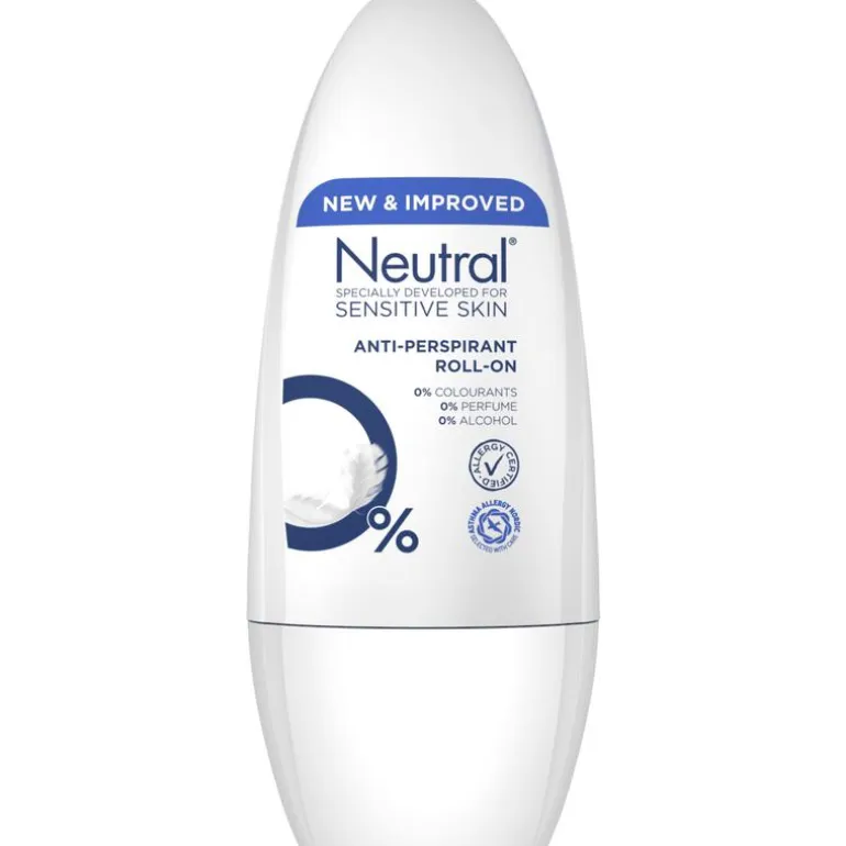 Neutral Sensitive Skin Deodorant Roller met verbeterde formule en een beter draaiende roller is geschikt voor de gevoelige huid. Een gevoelige huid kan geïrriteerd raken door bepaalde stoffen, zoals parfum en alcohol. Als je extra gevoelig bent voor deze stoffen, is de kans dat je okselhuid geïrriteerd raakt nog groter. Ook na het scheren kan de okselhuid wat gevoeliger zijn dan anders. De verbeterde Neutral Sensitive Skin Deodorant Roller bevat meer huidverzorgende ingrediënten en biedt langere bescherming tegen zweet. Zo kun je de hele dag doorkomen met een fris gevoel. De Neutral deodorant roller is geschikt voor dagelijks gebruik. De deodorant is speciaal ontwikkeld voor de gevoelige huid en bevat 0% parfum, 0% kleurstoffen en 0% alcohol. De deodorant is gemakkelijk aan te brengen dankzij de verbeterde draaiende roller. Een milde manier om fris te blijven, ook buiten je comfortzone. Wanneer je een allergie of een gevoelige huid hebt, mag dit geen belemmering zijn om van het dagelijks leven te genieten. Neutral heeft zich daarom gespecialiseerd in producten die het risico op huidirritatie verminderen. Alle producten van Neutral zijn geformuleerd om de kans op allergische reacties te minimaliseren, daarom bevatten ze geen parfum en kleurstoffen. Deze stoffen verhogen namelijk het risico op huidirritatie. Verder biedt Neutral een compleet assortiment van huishoudelijke producten en huidverzorgingsproducten die speciaal ontwikkeld zijn om het risico op allergische reacties of huidreacties te verminderen.
