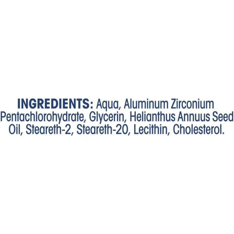 Aqua, Aluminum Zirconium Pentachlorohydrate, Glycerin, Helianthus Annuus Seed Oil, Steareth-2, Steareth-20, Lecithin, Cholesterol.