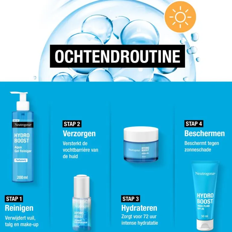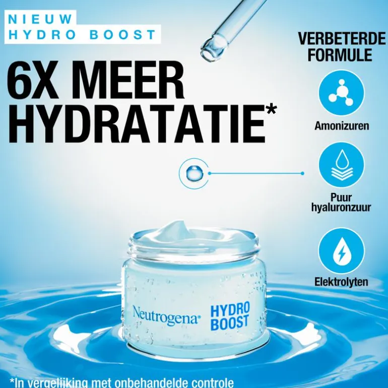 Ontdek nu de nieuwe en verbeterde Hydro Boost formule van Neutrogena! Dankzij de ultralichte watergelformule en hydraterende ingrediënten zoals: aminozuren, elektrolyten, en hyaluronzuur wordt de huid tot wel 6x meer gehydrateerd gedurende 72 uur. Dit resulteert in een soepele, gezond uitziende huid met een 80% sterkere huidbarrière De nieuwe formule bevat 20% meer hyaluronzuur dat helpt vocht vast te houden en de hydratatie te verhogen. Het aminozuur versterkt de huid en zorgt voor extra ondersteuning van de huidbarrière. De elektrolyten bevorderen de opname van de ingrediënten. De nieuwe Neutrogena Hydro Boost Aqua Gel is vrij van parfum, olie en niet-comedogeen. Ontwikkeld in samenwerking met dermatologen en geschikt voor de normale en gemengde huid. Ook voor de gevoelige en acne gevoelige huid. De nieuwe verpakking bevat 87% minder plastic en wordt geleverd in een 100% recyclebare glazen pot. Ontdek nu de nieuwe Neutrogena® Hydro Boost Aqua Gel!