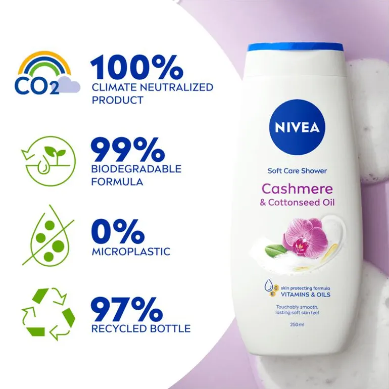NIVEA Cashmere & Cotton Seed Oil Douchegel 250ml biedt je elke dag een ultiem verwenmoment onder de douche. De zachte formule met vitamine C, E en verzorgende oliën reinigt mild, helpt uitdroging te voorkomen en zorgt voor een langdurig zacht en glad huidgevoel. De douchegel is pH-huidneutraal, dermatologisch goedgekeurd en perfect voor dagelijks gebruik. Geniet van de verfijnde geur van orchidee terwijl je huid verzorgd en beschermd aanvoelt. De formule is 99% biologisch afbreekbaar en de fles is gemaakt van 97% gerecycled materiaal* – goed voor je huid én het milieu.