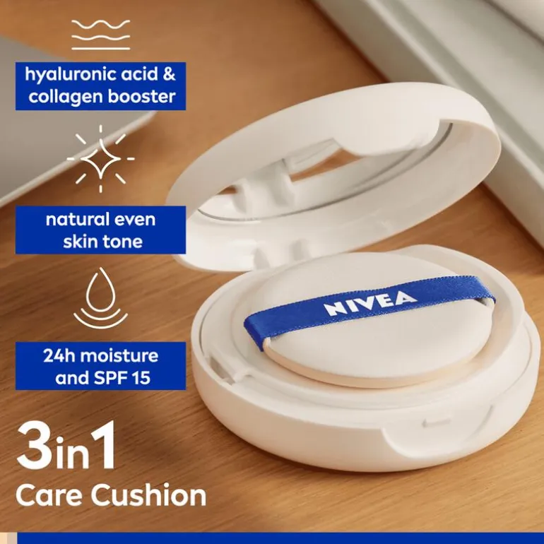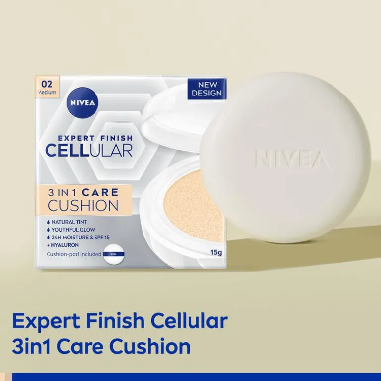 Egaliseer je teint en geniet van een ademend gevoel dankzij de innovatieve NIVEA Expert Finish CELLular 3in1 Care Cushion Foundation. Deze cushion foundation zorgt ervoor dat je huid een prachtige finish krijgt, zonder de natuurlijke teint te maskeren. De formule smelt samen met de huid en geniet van een natuurlijke, jeugdige glow. Tegelijkertijd wordt de huid 24 uur lang gehydrateerd en geniet je van de bescherming die SPF 15 biedt. Elke touch-up geeft je onmiddellijk een fris uitziende huid die zacht en glad aanvoelt.NIVEA Expert Finish CELLular 3in1 Care Cushion maakt niet alleen oneffenheden minder zichtbaar. Zo is de cushion foundation ook verrijkt met hyaluronzuur. Deze stof zorgt voor intensieve hydratatie van de huid. Tegelijkertijd geniet je van een natuurlijke boost collageen, waardoor je huid steviger en veerkrachtiger aanvoelt. Gebruik deze NIVEA CELLular filler foundation dan in combinatie met de NIVEA 3in1 Concealer Medium. • Egaliseert de teint op een natuurlijke manier• Hydrateert de huid tot 24 uur lang• Verrijkt met hyaluronzuur en collageenbooster• Met SPF 15• Met cushionpad en spiegel